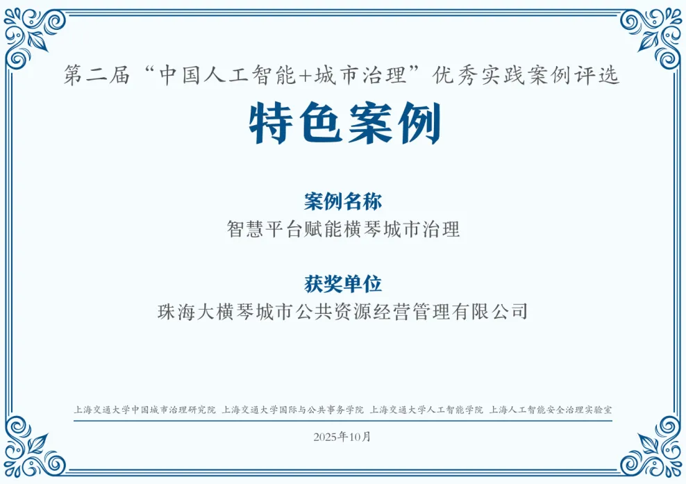 喜报!珠光集团《智慧平台赋能横琴城市治理》案例获评“中国人工智能+城市治理”特色案例!(2025-10-29)